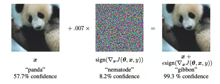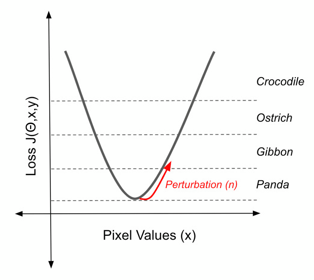این نمونه خصمانه خاص با استفاده از روش علامت گرادیان سریع (FGSM) ایجاد شده است. نویز (η) با ابتدا گرفتن گرادیان (∇x) تابع زیان (J(θ,x,y) نسبت به داده‌های ورودی (x) محاسبه می‌شود.