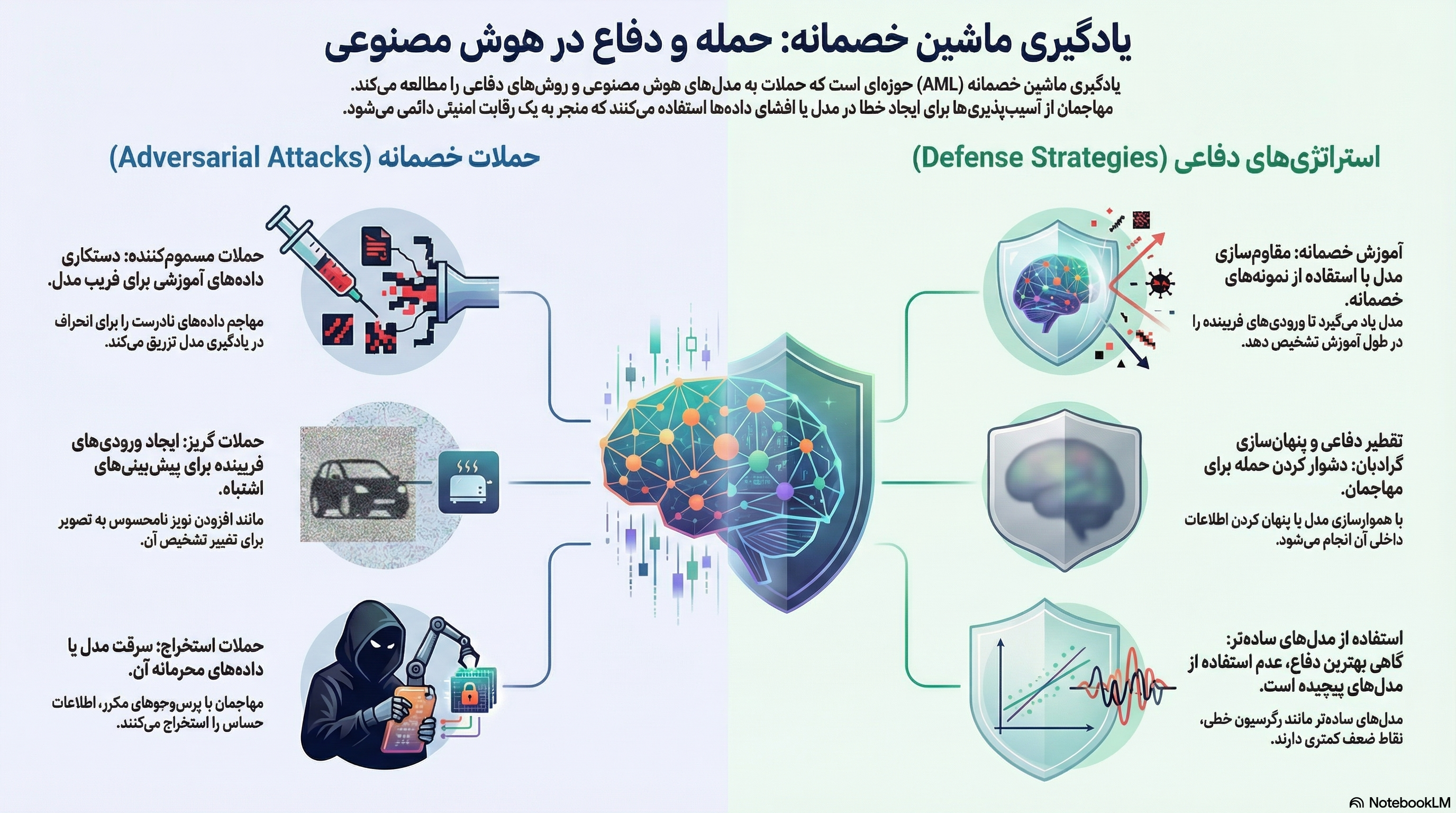 در دنیای مدرن، مدل‌های یادگیری ماشین (ML) با حملات مشابهی روبرو هستند. مدل‌ها چیزهای پیچیده‌ای هستند و اغلب درک ضعیفی از نحوه پیش‌بینی آن‌هاداریم. این امر باعث ایجاد نقاط ضعف پنهانی می‌شود که می‌تواند توسط مهاجمان بهره‌برداری شود. آن‌هامی‌توانند مدل را فریب دهند تا پیش‌بینی‌های نادرستی انجام دهد یا اطلاعات حساس را فاش کند. حتی می‌توان از داده‌های جعلی برای آلوده کردن مدل‌ها بدون اطلاع ما استفاده کرد. زمینه یادگیری ماشین خصمانه (AML) با هدف رفع این نقاط ضعف ایجاد شده است.