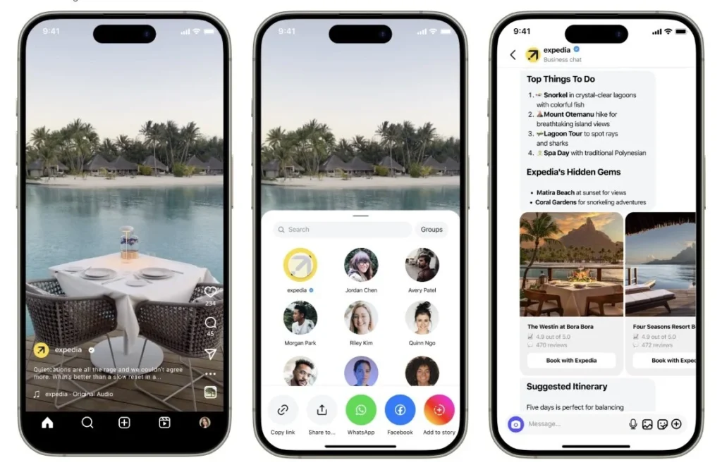 این ابزار سفر با طراحی کاربرپسند، استفادهای ساده دارد. کافی است یک ویدئوی اینستاگرامی از مقصد مورد علاقه خود را از طریق پیام خصوصی برای اکسپدیا ارسال کنید، درست مانند زمانی که آن را برای یک دوست میفرستید. سپس چتبات هوش مصنوعی گفتوگویی آغاز میکند و درباره علایق شما سؤال میپرسد: «بیشتر به تاریخ علاقهمندید یا غذا، طبیعت، زندگی شبانه یا چیز دیگری؟» و بر اساس پاسخهایتان پیشنهادهای متناسبی ارائه میدهد.