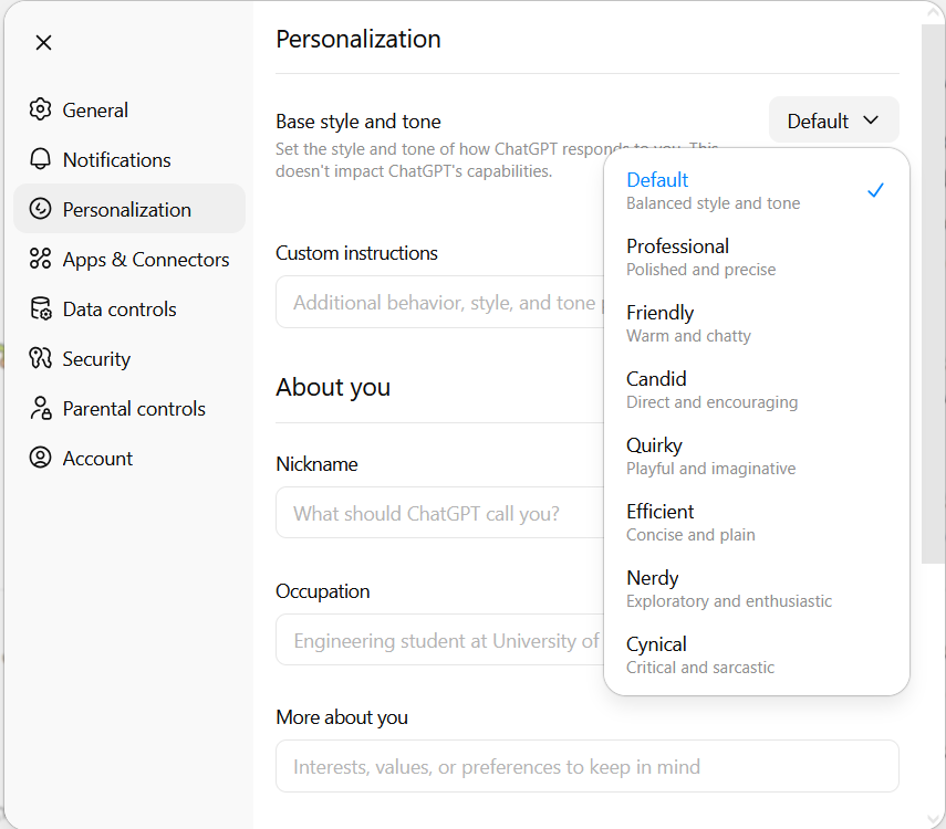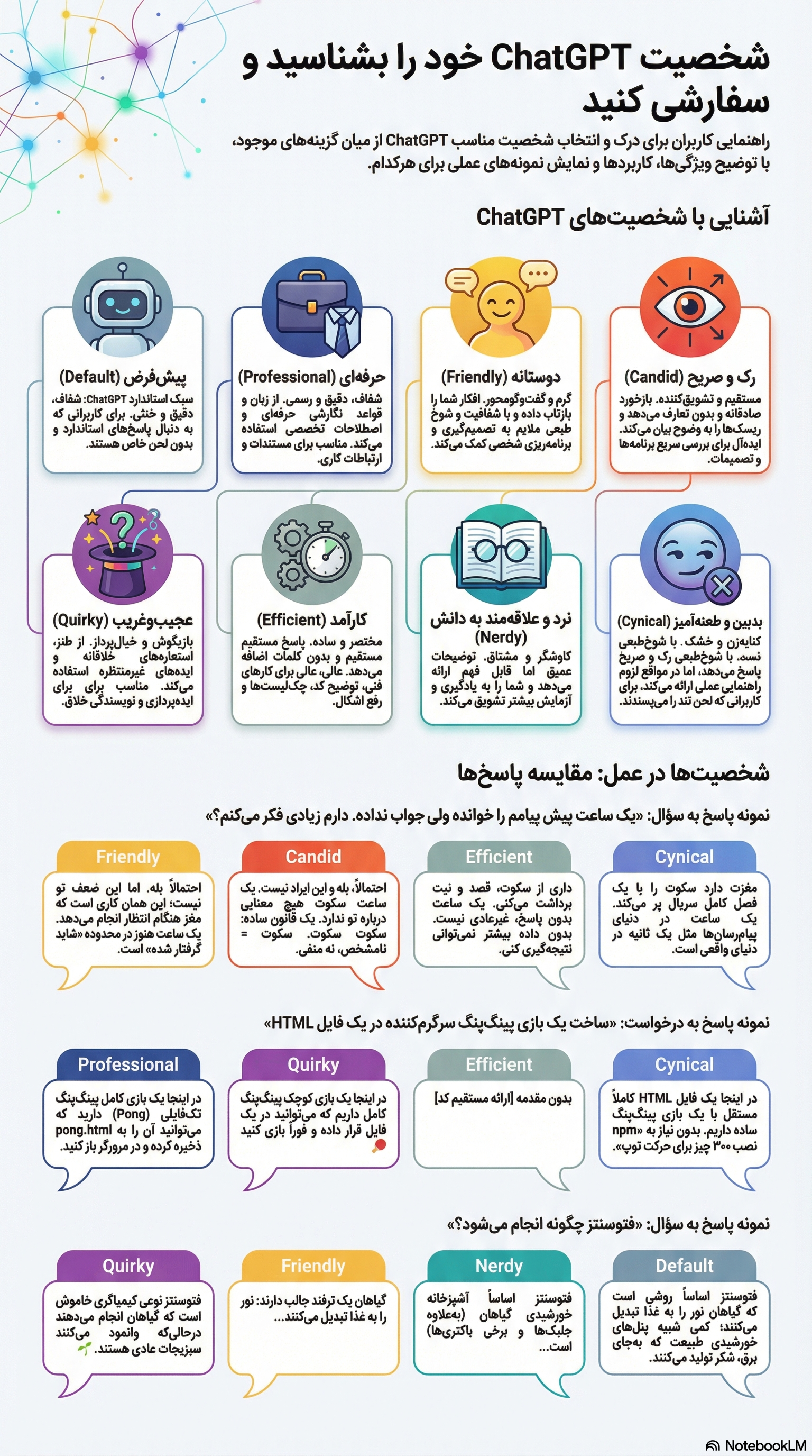 شخصیت (Personality)؛ سبک و لحن پاسخ‌گویی ChatGPT به شماست. این شخصیت ترکیبی از ویژگی‌ها، صدا و رفتار است که تعیین می‌کند پاسخ‌ها چه حسی داشته باشند؛ چه دوستانه و صمیمی باشند، چه مختصر و حرفه‌ای، یا هر سبک دیگر.