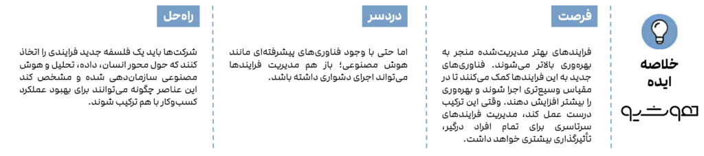 کمبود پشتیبانی فناورانه بهویژه در رویکردهای بهبود تدریجی فرایندها مانند ناب و شش سیگما رفتهرفته سبب کاهش محبوبیت تفکر فرایندی شد. اما طی سالهای اخیر، فناوریهای جدید فرصتهایی ایجاد کردهاند تا سازمانها مدیریت فرایند را متحول کنند. این یکی از اصلیترین دلایلی است که نویسندگان معتقدند سازمانها اکنون میبایست دوباره آن را بهصورت گسترده به کار گیرند.