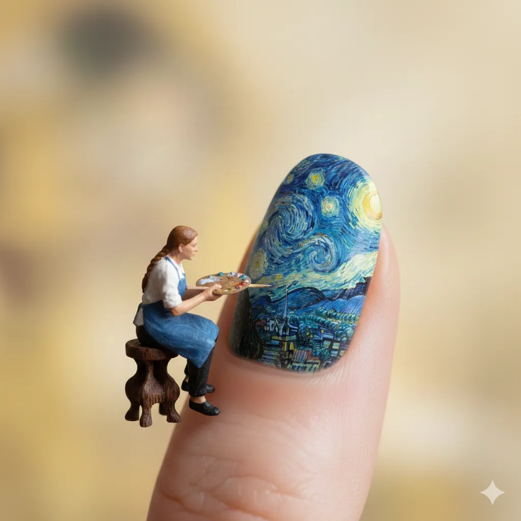 این پرامپت یکی از پیچیدهترین چالشهای بصری یعنی حفظ تناسبات در ابعاد بسیار کوچک را هدف قرار میدهد. با وارد کردن این پرامپت، یک نقاش در ابعاد بسیار کوچک در حال طرح زدن روی ناخن دست یک انسان است. ویژگی بارز آن، درک دقیق هوش مصنوعی از انحنای ناخن و بازتاب نور استودیو روی سطح براق آن است. Nano banana به طور خودکار نورپردازی را با رنگهای نقاشی (مانند طرح شب پر ستاره ونگوگ) هماهنگ میکند تا خروجی کاملاً واقعگرایانه به نظر برسد. با وارد کردن نقاشی مورد نظر خود در قسمت مشخص شده این پرامپت، میتوانید طرح دلخواه را تولید کنید.