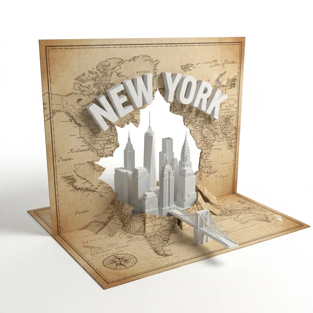 3. The Metropolis Emerging: Stylized foam-core-like buildings in matte white The Brooklyn Bridge arcs from one map fold to the city “NEW YORK” in 3D letters arches over the tear like a monumental portal.
