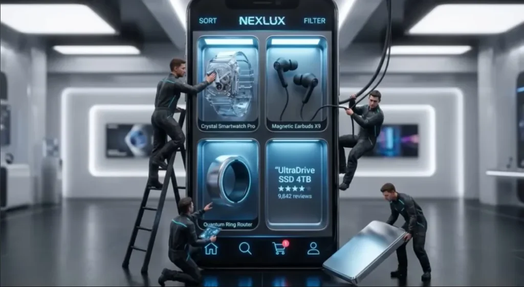 Prompt: A hyper-realistic 3D commercial photograph of a giant smartphone standing vertically on a [FLOOR MATERIAL] studio floor. The phone is viewed from a slight 3/4 perspective angle to emphasize depth. The screen acts as a [STYLE ADJECTIVE] physical display cabinet with four deep, recessed alcoves arranged in a 2×2 grid. Inside: volumetric 3D products, casting deep shadows. UI Theme: “[THEME NAME]” uses a [COLOR PALETTE] palette, with top bar (SORT | BRAND | FILTER) and a bottom nav featuring [ICON COLOR] icons. Cart icon has red badge showing ‘1’. Four lifelike miniature workers in [UNIFORM DESCRIPTION] interact with the products. Each has realistic skin, hair, clothing detail. Lighting: [LIGHTING STYLE] to highlight [TEXTURE].