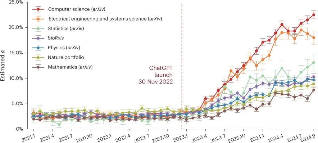 بر اساس این تحلیل، تا سپتامبر ۲۰۲۴، نشانههایی از استفاده احتمالی از LLMها در ۲۲.۵درصد چکیدهها و ۱۹.۵درصد مقدمههای مقالات علوم رایانه دیده شده است. درحالیکه در نوامبر ۲۰۲۲ این رقم در حدود ۲.۴درصد و تقریباً در همه حوزهها و انواع مقالات مشابه بوده است. همچنین در رشته مهندسی برق نیز تا سال ۲۰۲۴ میزان استفاده احتمالی از LLMها بالا بوده است بهطوریکه گمان میشود ۱۸درصد در چکیدهها و ۱۸.۴درصد در مقدمهها در مدلهای زبانی بزرگ استفاده شده باشد در مقابل، استفاده از LLMها در حوزههایی مانند ریاضیات بسیار کمتر بوده است؛ ۷.۷درصد در چکیدهها و ۴.۱درصد در مقدمهها. مجلات منتشرشده در مجموعه Nature نیز رشد کمتری را نشان دادهاند؛ تنها ۸.۹درصد در چکیدهها و ۹.۴درصد در مقدمهها.