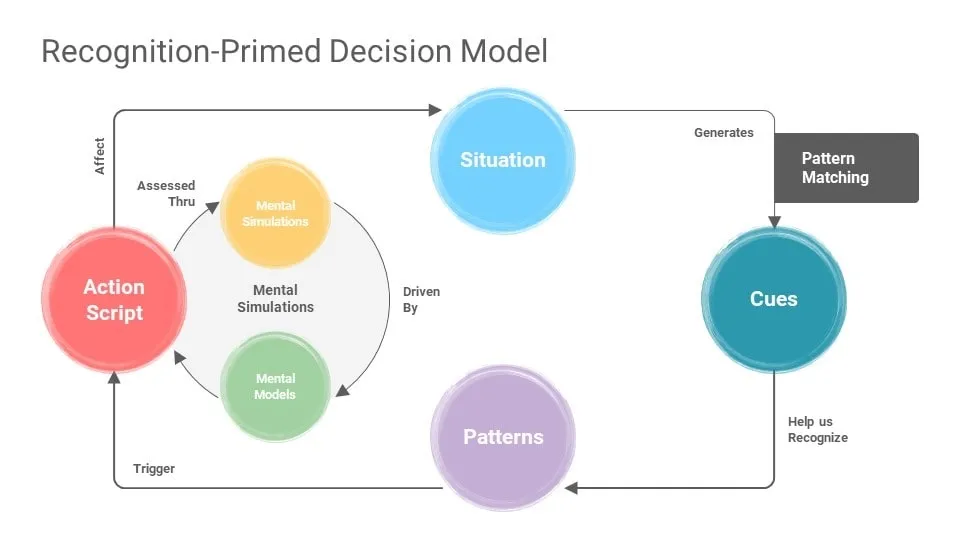 در موقعیتهای بحرانی یا تصمیمهای پرریسک، تصمیمگیرندگان تحتفشار زمانی، عدم قطعیت و خطر بالا عمل میکنند؛ یعنی شرایطی که فرصت تحلیلهای طولانی یا مشورت را نمیدهد. بر اساس مدل «تصمیمگیری مبتنی بر شناخت الگو» از «گری کلاین» (Gary Klein’s Recognition-Primed Decision – RPD)، در اینگونه موقعیتها افراد باتجربه باتکیهبر شناخت الگو، شبیهسازی ذهنی و شهود، تصمیمهایی سریع اما مؤثر میگیرند. بهجای ارزیابی چندین گزینه، تصمیمگیرنده نشانههای آشنا را شناسایی میکند، آنها را با تجربههای قبلی تطبیق میدهد و بر اساس اولین گزینه قابلاجرا اقدام میکند. مثلاً تیم امنیت سایبری ممکن است بلافاصله پس از مشاهده نشانهای از نفوذ، کل سیستم را غیرفعال کند تا از آسیب بیشتر جلوگیری کند، بدون آنکه منتظر تحلیل کامل بماند. این مدل، آمیزهای است از استدلال مبتنی بر نشانهها، علیت، میانبُرهای ذهنی و شهود که فرایند تصمیمگیری را ساده و به سمت اقدام هدایت میکند.