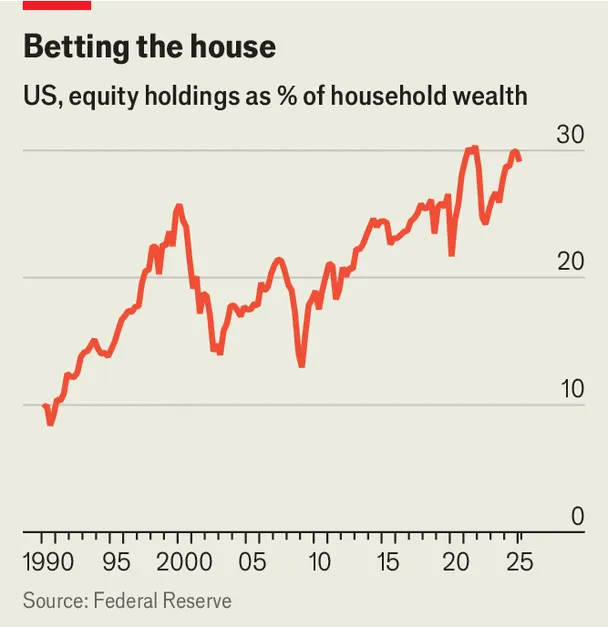 بااینحال، از جنبهای دیگر، اقتصاد آمریکا در موقعیتی تاریخی و منحصربهفرد قرار دارد و مواجهه افراد با بازار سهام هرگز تا این حد بالا نبوده است. مالکیت سهام حدود ۳۰ درصد از ثروت خالص خانوارهای آمریکایی را تشکیل میدهد، درحالیکه این رقم در اوایل دهه ۲۰۰۰ و در اوج حباب داتکام، ۲۶ درصد بود. این مالکیت عمدتاً در میان ثروتمندان متمرکز است؛ یعنی کسانی که مصرف آنها در ماههای اخیر محرک رشد اقتصادی بوده است. به گفته مشاوران Oxford Economics، مصرفکنندگان بهازای هر دلار تغییر در ثروت مالی حدود ۱۴ سنت افزایش یا کاهش مصرف دارند. این تغییرات بیشازپیش به چند شرکت بزرگ وابسته است که چشمانداز آنها با هوش مصنوعی شکل خواهد گرفت.