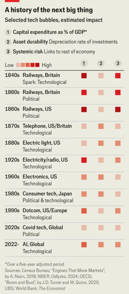 اما هوش مصنوعی در کجای این طیف قرار میگیرد؟ برای ارزیابی، The Economist ده حباب تاریخی را بررسی و آنها را بر اساس چهار عامل جرقه، سرمایهگذاری تجمعی، دوام سرمایهگذاری و گروه سرمایهگذار سنجید. بر اساس برآورد تقریبی، حباب احتمالی هوش مصنوعی فقط از سه حباب بزرگ راهآهن قرن نوزدهم عقبتر خواهد بود.
